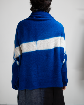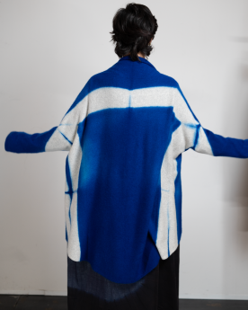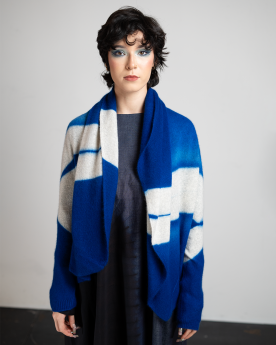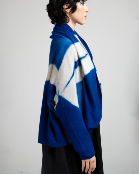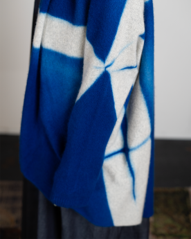 La pièce est sublimée par la technique Itajime Shibori "Books", une méthode traditionnelle de teinture japonaise qui crée des motifs uniques et des dégradés subtils de couleurs. La combinaison Royal Blue et Light Grey apporte contraste et sophistication, transformant cette cape en un accessoire à la fois luxueux et visuellement captivant.