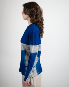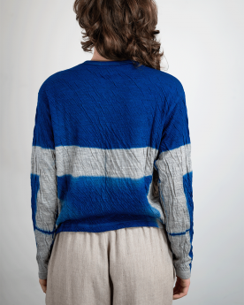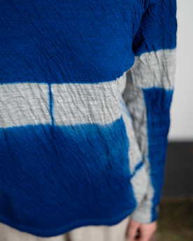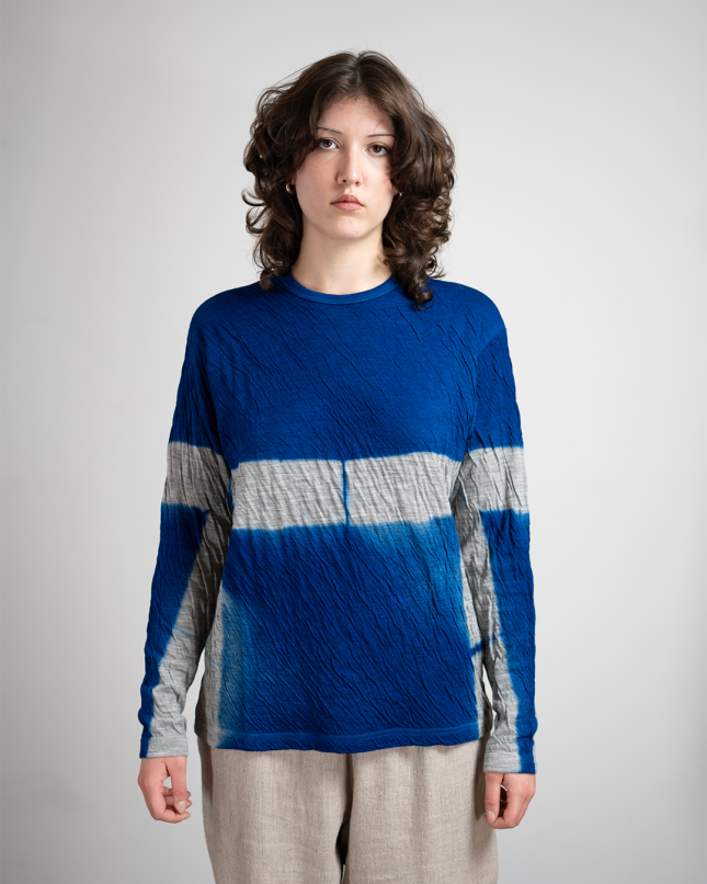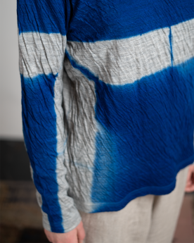 La pièce est sublimée par la technique Itajime Shibori "Books", une méthode traditionnelle de teinture japonaise qui crée des motifs uniques et des dégradés subtils, faisant de chaque t-shirt une pièce singulière. La combinaison de couleurs Royal Blue et Light Grey confère à ce vêtement une allure moderne et graphique, tout en restant polyvalent pour composer des looks décontractés ou sophistiqués.