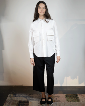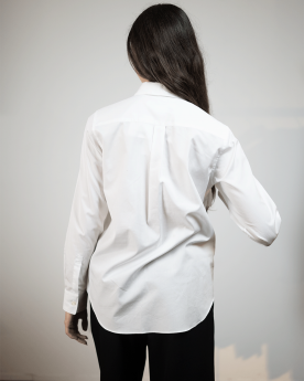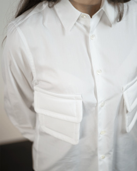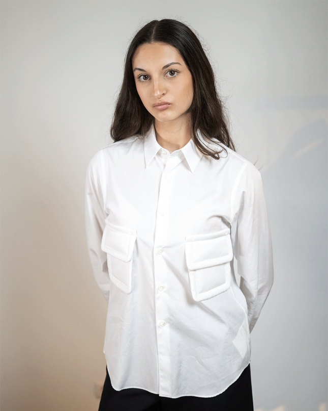 Chemise blanche à manches longues, coupe droite, dotée d’un col classique et d’une fermeture frontale boutonnée. Elle présente deux poches plaquées sur la poitrine avec contours légèrement rembourrés.