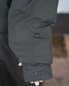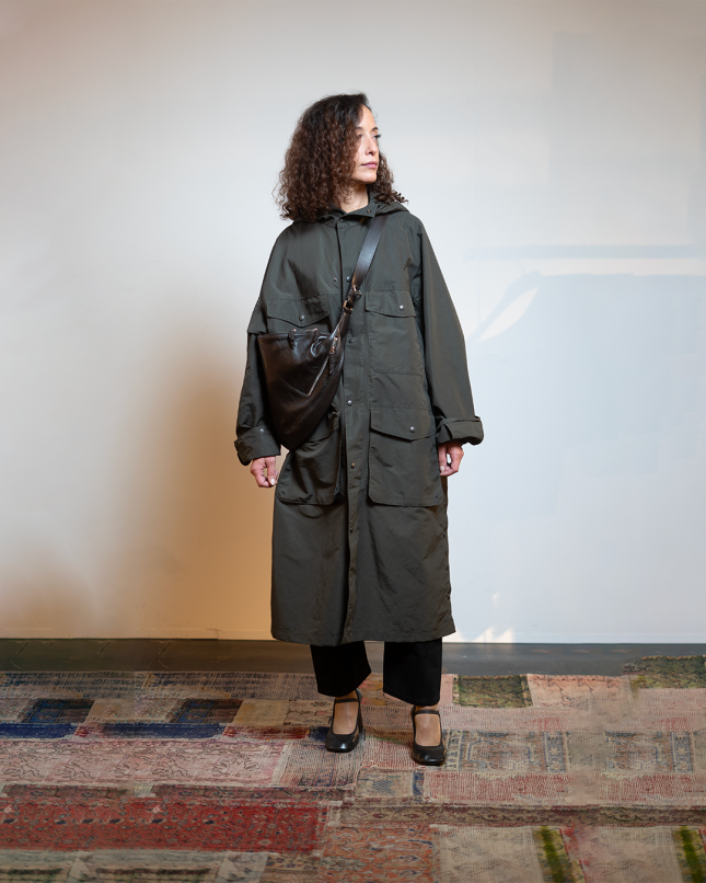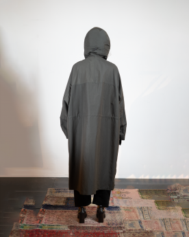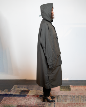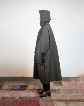 Trench utilitaire imperméable à capuche, au style épuré et fonctionnel. Il se ferme à l’avant par zip et boutons‑pression, et se règle à la taille grâce à un cordon. Les poches avant à boutons‑pression et les manches longues boutonnées complètent ce modèle pratique et élégant.