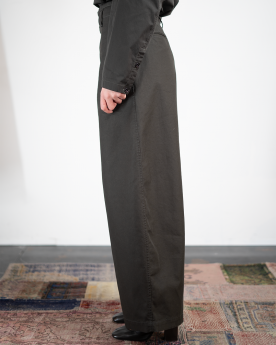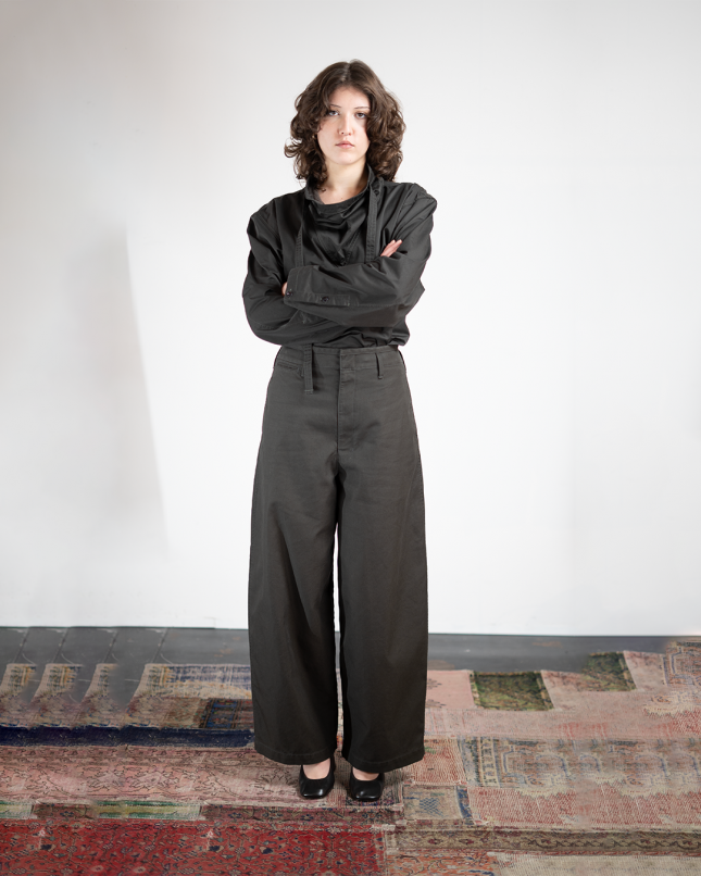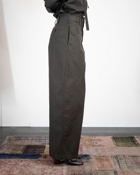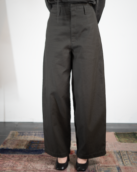 Ce pantalon chino femme incarne l’esthétique Lemaire entre confort et élégance. Il est conçu dans une toile de coton épais (heavy cotton twill) japonaise ayant subi un traitement de rinçage qui adoucit le tissu et permet à la matière de se patiner avec le temps.
