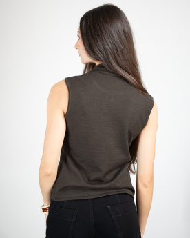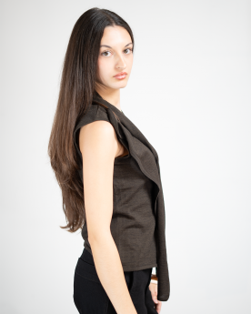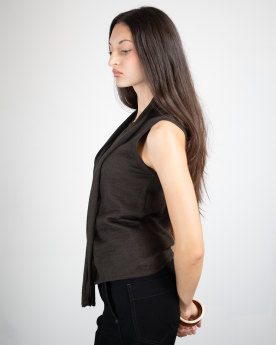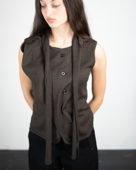 Ce cardigan asymétrique sans manches fait partie d’une garde-robe modulable et fluide, typique de l’esthétique Lemaire. Il est tricoté dans un mélange de laine mérinos et d’acrylique, donnant une maille souple, sèche et douce qui évolue avec le mouvement.