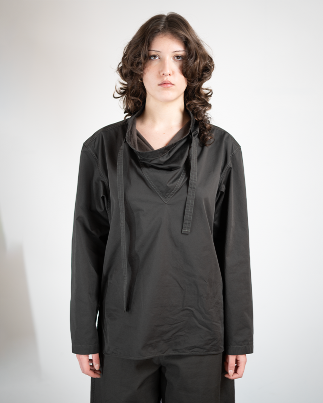 Cette vareuse Top pour femme reflète l’attrait de Lemaire pour le workwear et les pièces archétypales réinventées avec soin. Elle est réalisée en coton léger à effet satiné, un tissu dont la surface va se patiner avec le temps pour développer une texture plus riche et élégante.