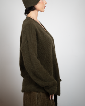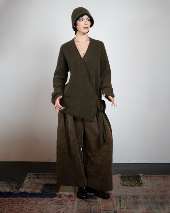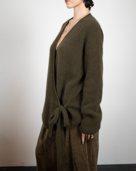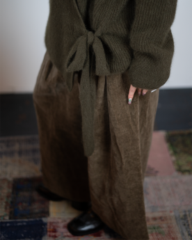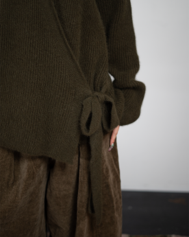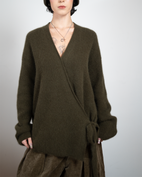 Le Tie‑Detail Cardigan d’Uma Wang allie élégance contemporaine et confort luxueux grâce à sa matière raccoon ultra-douce. Sa coupe enveloppante et son détail de lien à nouer créent une silhouette sculpturale et moderne, emblématique du style minimaliste et architectural de la marque.