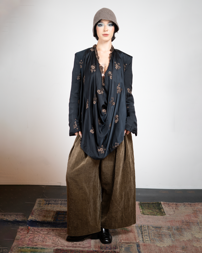 Le Kiona Top d’Uma Wang est une pièce féminine alliant raffinement et légèreté. Confectionné en Italie à partir d’un mélange de matières nobles, il propose une silhouette fluide et élégante enrichie d’un motif brodé floral subtil, signature de style artisanal et contemporain.