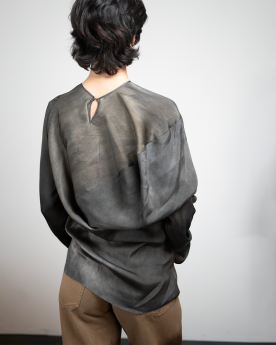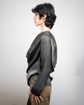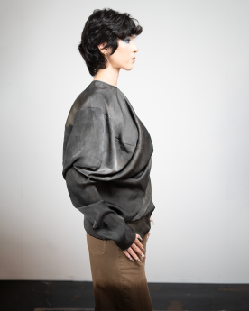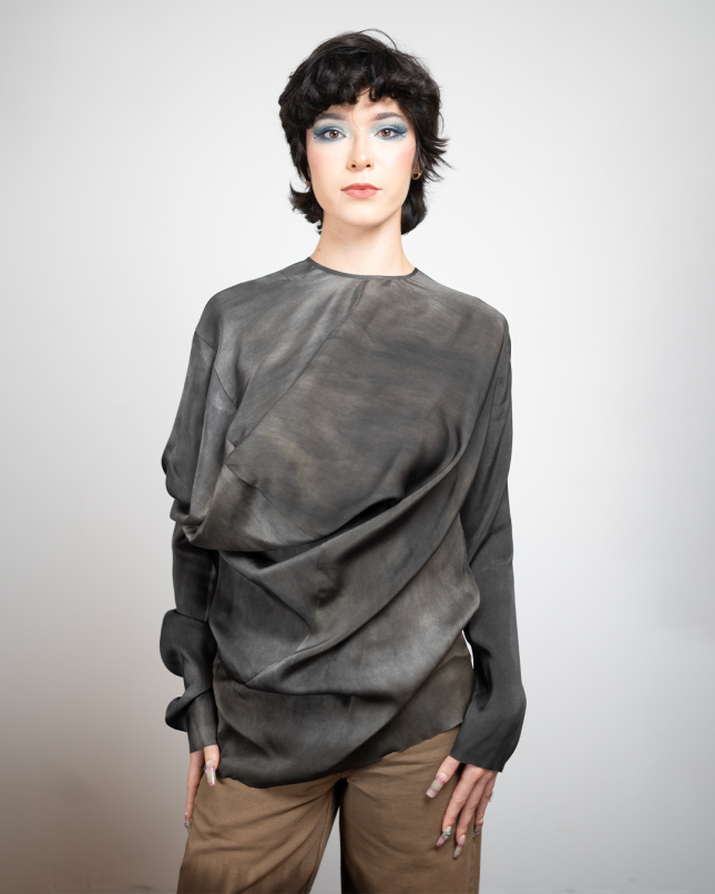 Le Trek Top d'Uma Wang joue sur les volumes et la fluidité grâce à son mélange de soie Dark Grey au tombé naturel. Les empiècements croisés à l'avant et l'ourlet asymétrique dessinent une silhouette contemporaine, sublimée par une ouverture goutte discrète au dos.