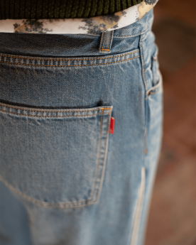 Le Jean UP2E1503 Undercover se distingue par son denim à lisière et ses panneaux en molleton de coton pour un confort optimal. Confectionné au Japon en coton 100% premium, il présente une texture robuste et authentique.