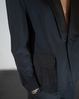 La Veste UP2E1101 Undercover se distingue par sa silhouette bomber à col châle et ses manches structurées aux bords effilochés. Confectionnée en polyester et laine, elle se pare de poches passepoils et d'un bouton unique, pour un look contemporain et raffiné.