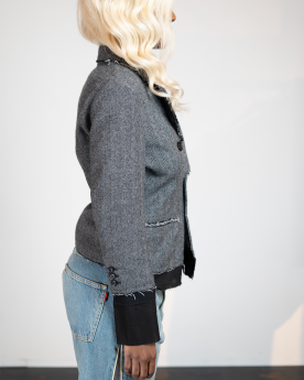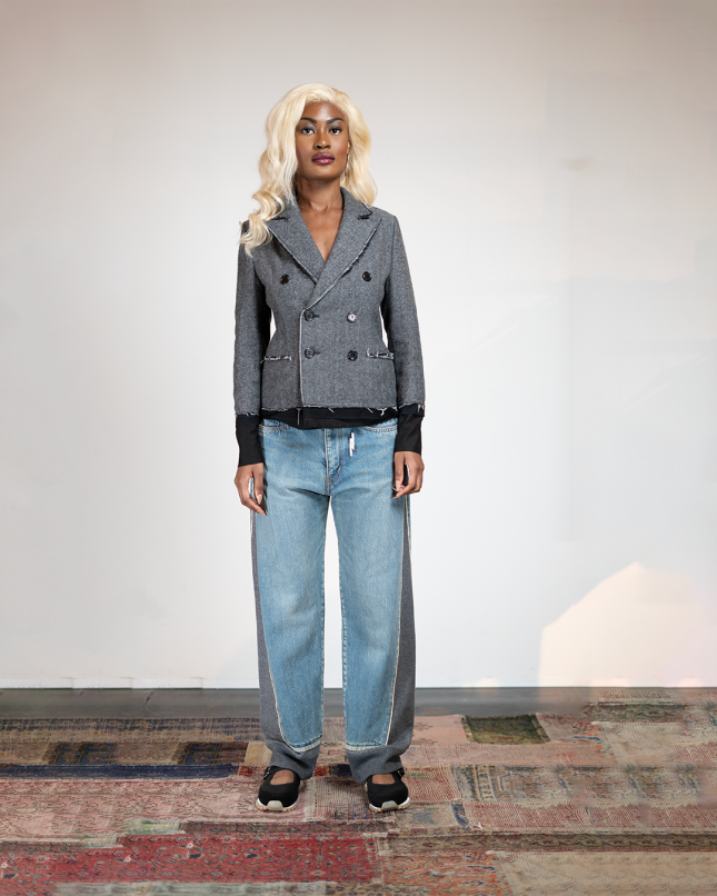 La Veste UP2E1104 se distingue par son tissage chevrons en mélange de laine et son ourlet superposé, qui apportent profondeur et modernité à la silhouette. Confectionnée à partir de laine, coton et polyester, elle offre une texture structurée et élégante, sublimée par des poches passepoilées à l'avant et une doublure en cupro, pour un look raffiné et contemporain.