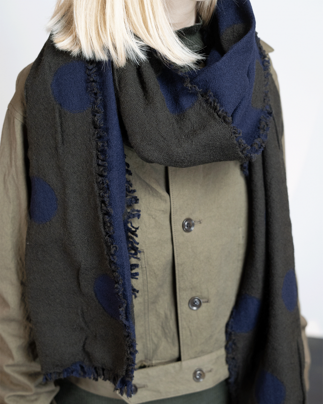 L'Écharpe à pois Y's se distingue par son motif à pois audacieux, sa construction double face et ses bords frangées. Le jeu de couleurs kaki et bleu apporte du caractère tout en restant élégant. Confectionnée en laine, elle offre chaleur et douceur, idéale pour une superposition hivernale polyvalente.