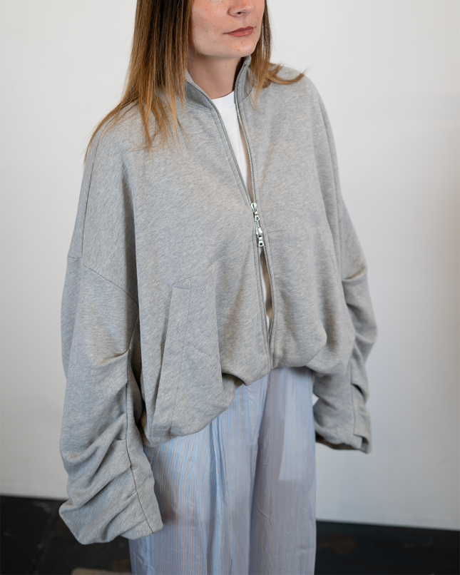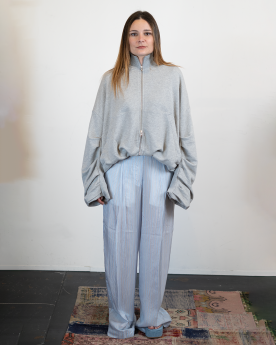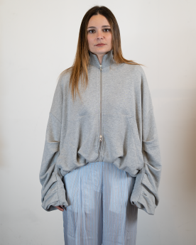 Inspirée du vestiaire utilitaire revisité, elle se distingue par son col montant et sa fermeture zippée, apportant une touche fonctionnelle à une pièce au design affirmé. Les détails de manches subtilement travaillés viennent renforcer son identité visuelle singulière.