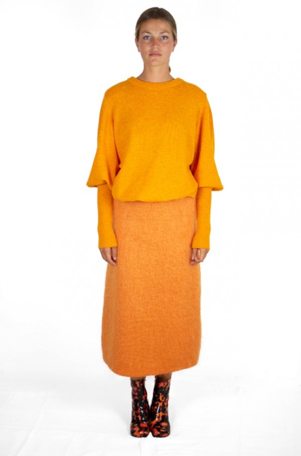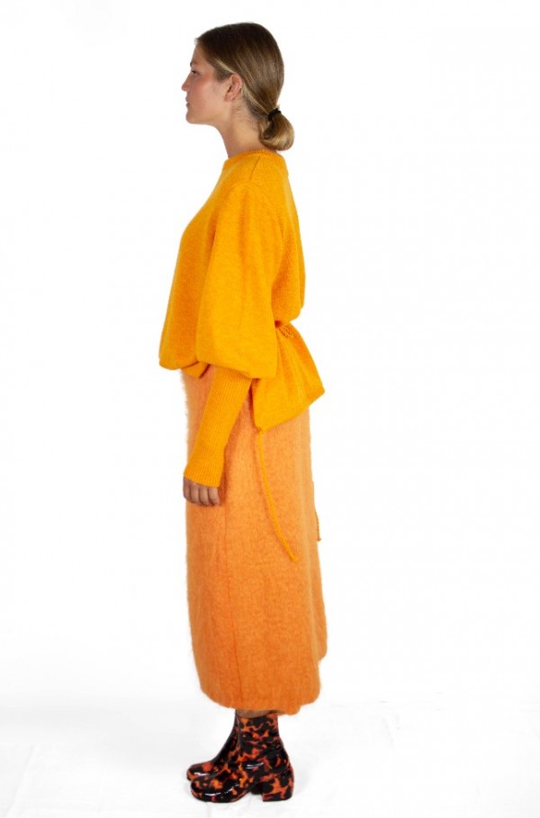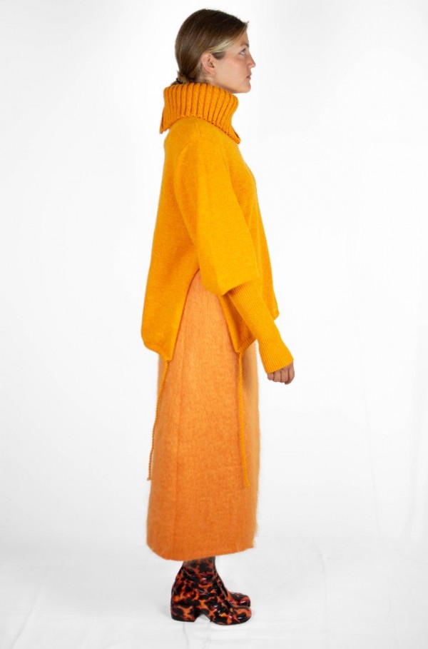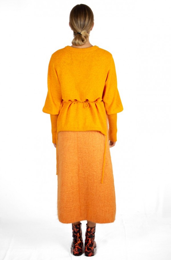 Pull à encolure rond tricoté en laine à fines côtes. Bords côtes et fentes resserrées par un cordon en maille.